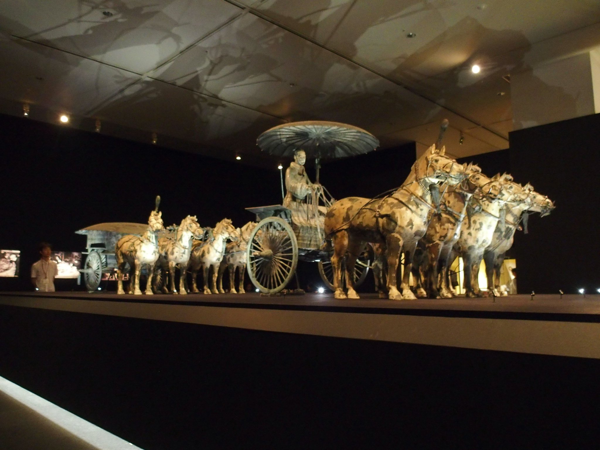 始皇帝は、自ら大規模事業として手がけた広大な始皇帝陵において、死後の世界でも兵隊たちを率いて中華世界の王として活躍することを夢見たと言われます。この4頭立て馬車も、王墓に副葬品として収められたのですが、非常にリアルで精巧かつ豪華な作りが印象的でした。(※展示品はレプリカです)
